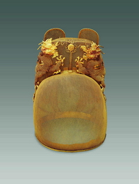 花纹,空档均匀,疏密一致,无接头,无断丝。后山部分是采用纍丝錾金工艺而成的二龙戏珠图案,龙的造型雄猛威严,具有强烈的艺术装饰效果。翼善冠用极其纤细金丝编结,采用传统的掐丝、纍丝、码丝、焊接等方法,工艺技巧登峰造极,充分反映了明代金细工艺的高超水平。 |