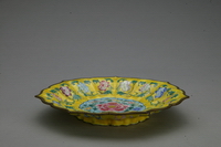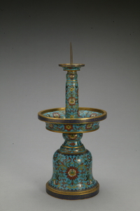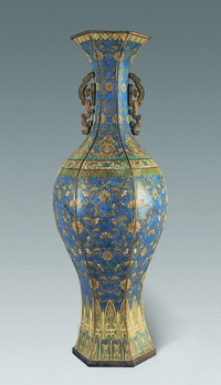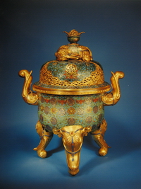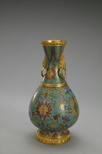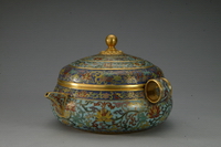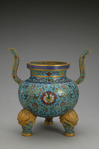 此器器型高大美观,豪华富丽,用于宫廷陈设。器身通体施天蓝色珐琅釉,彩色缠枝莲间饰万寿团花,以铜镀金象首为足、耳。该器寓意太平吉祥,掐丝细腻流畅,制作工艺复杂精致,表现出乾隆时期掐丝珐琅器物向多种技法发展的倾向。 |