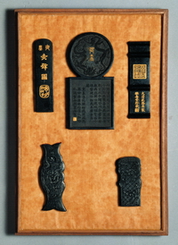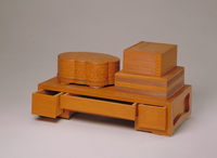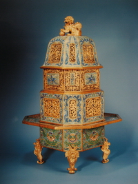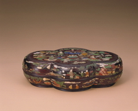 此器是宫廷中盛装食物的攒盒,以螺钿、玛瑙、染牙及多种宝石,在盖面镶嵌《八仙祝寿图》,外壁雕《长者游春图》,工精文细,雍荣华贵,充分体现了皇家气派。 |