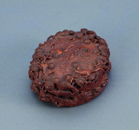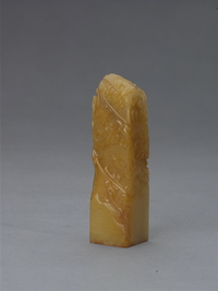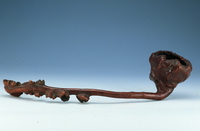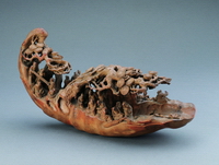 此器刀法流畅,以形制胜。图案刻划简洁,螭龙姿态活泼,为犀角雕中精品。底有阳刻“鲍天成制”篆书印章款。鲍天成为明晚治犀能手。 |