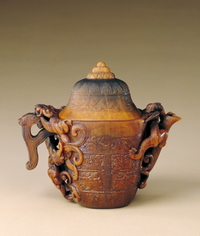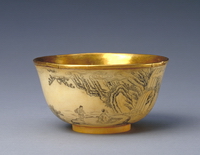 此杯采用螺旋式构图,刻画了晋时王羲之等人在兰亭欢聚宴饮的画面。全器刻划二十三个人物,衬以崇山峻岭、小桥亭榭,刀法有力,层次分明。 |