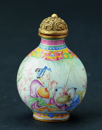 卣身浅蓝釉地,饰掐丝回纹锦地,腹部饰饕餮兽面纹,兽面纹用色丰富,充满世俗的浪漫气息。该器仿古青铜器,掐丝匀称细腻,填釉饱满,工艺精致,为乾隆时期掐丝珐琅器精品。 |