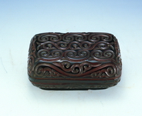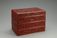 盒面雕山水人物纹,布局错落有致,盒壁雕牡丹花卉,花枝繁茂。该器漆层肥厚,刀功熟练,磨制细腻,漆色光亮,堪为佳品。 |
