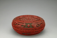 剔彩备红、黄、绿三色,盒面圆形开光内雕聚宝盆,上托春字,春字中心开光,内刻寿星与松柏、文鹿,取“春寿”之意。盒壁上下有开光四组。该器运刀犀利,漆色纯真鲜艳,代表了清中期雕漆水平。 |