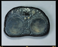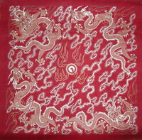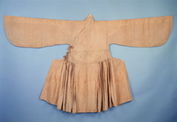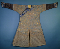 浅驼色四经绞罗地,罗地妆花,在前胸、后背、盘领周围及两肩有一柿蒂形过肩蟒,蟒头位于前胸,两袖各有一直袖蟒。下摆分成三幅,一长蟒贯穿全幅。 |