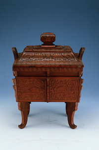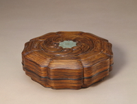 此器是乾隆帝储存诗册的拜匣。盒为苏州所进贡品,如意馆画工根据旨意绘出盒形图样,由造办府配屉,将御制诗按方位刻在檀香木雕碧波莲花八瓣形盘凹槽内,并在凹槽内放置古鱼玉佩。此器盖面棕竹肌理如激流汇成的漩涡,盖底严丝合缝,是集工艺之大成的作品。 |