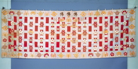 酱色暗花缎地,以月白色织锦缎作田字格,内缀红、黄、绿、粉、白等色组成的滚边钉绫朵花,花心打籽绣,缀红蓝宝石、珊瑚、珍珠,领襟处钉织金缎楷书“佛”字三个,每个佛字上缀一颗珊瑚。 |