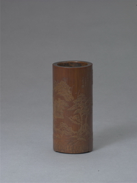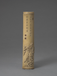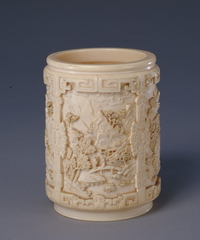 笔筒外壁开光内雕携琴访友、小桥相会、泛舟和观瀑四图。图中山峦叠翠,流云缭绕,景色绮丽,气象万千。此器刀法灵透,构图如四幅山水画,精巧、秀美、古雅,具尺幅千里之功,为清代牙雕精品。 |