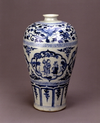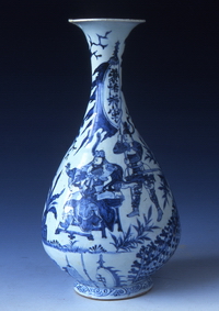 玉壶春瓶为酒壶的一种,古代粮食酒常冬天酿造,春天饮用,故多以“春”为名,唐代司空图“玉壶买春”便来源于此。《水浒传》记有:“酒保取过两樽玉壶春酒,此是江州有名的上色好酒”。同时也用于插花,有“玉壶先春”之说。青花瓷虽始于唐,但成熟于元,这件玉壶春瓶不仅造型优美,青花呈色纯正艳丽,反映了当时元青花的烧造水平。纹饰取材于元代流行的杂曲人物故事,再现了秦朝镇守北方的蒙恬将军的威严气概,但是人物服饰、道具都为元代风格。 |