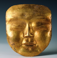 银面具出土时覆盖于死者面部,保存完整。用薄银片制成,面部轮廓清晰,眉骨突出,双目闭合,双唇紧闭,神态安详。耳下及鬓两侧有孔,可系结。契丹贵族死后,面部往往罩一件面具样的金属片,躯体则用锦彩络缠或用银铜丝网络络住。这是因为契丹人相信金属面具和网络可罩护尸体,存亡者之魂并且保护尸体不朽,可以死而复生,与汉代使用“玉衣”的丧葬习俗相同,也是契丹贵族厚葬风尚的反映。 |