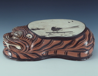 枕以虎为造型。猛兽为枕可镇妖避邪、早得贵子。唐代韦后的姐姐出嫁后便用豹、熊形枕,以辟魅求子。金代器物纹饰常出现虎、豹、鹿等,也与其民族“秋捺钵”(秋天狩猎)的生活习俗有关。此枕将虎的威猛及水鸟的灵巧和谐地组合一起,体现了工匠的丰富想像力。枕底有墨笔行书“大定二年六月廿六日张家”11字,应是买主随手写下的。瓷枕为夏季寝具,宋代瓷枕上有题诗为:“久夏天难暮……一枕最幽宜。”磁州窑为我国北方著名的民间瓷窑,以白地黑花装饰为特色,画面活泼自然,笔法简练豪放,图案散发着浓郁的生活气息,具有官窑所缺乏的奔放、洒脱的自然之美。 |