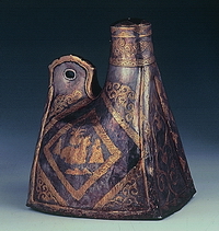 个四瓣花朵;壶颈四周錾有牡丹纹,壶身两面錾刻精巧,均在菱形图案中錾刻一只花鹿,鹿前后各錾刻山石、灵芝、海水,犹如仙境,纹饰部位鎏金。纹饰、制作工艺与唐代中后期相近,体现了契丹民族与中原地区的交往和文化交流。此壶是已见辽代金银器中之精品,是目前发现的惟一一件辽代银质马镫壶。 |