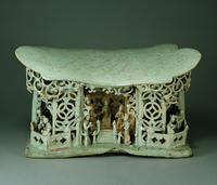 枕身为雕塑彩棚戏台,四面各有演出场面,戏台内塑有人像十八尊之多,前有主人与侍从,两侧、背后有菩萨、八仙及童男、童女,塑工精细周到,人物形象各异,无一雷同。众多演员正在演出一场戏剧,反映了元代戏剧流行的社会风尚。瓷枕镂雕精致,集建筑、舞台与瓷塑艺术于一体,表现出元代戏剧艺术的面貌及景德镇窑工高超的制瓷工艺,是珍贵的艺术品,也是研究元代戏曲的重要资料。 |