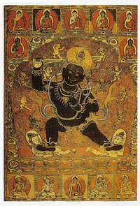 不动明王是藏传佛教的本尊之一。“不动”,指慈悲心坚固,无可撼动。他是奉大日如来教令,降伏一切恶魔之大威势明王。其形象特征是童子形,表示护法忠诚无二,如意纯真。身体蓝色,一面二臂,右手高举着一把有智慧火焰缠绕的利剑,左手执拘绑烦恼的金刚绳,身绕一龙,足下踩着象鼻天神及大自在天神,下身穿虎皮下袍,姿态优美,全身有智慧火焰围绕,威武刚健中,展现出特有的神态。上有大日如来等七佛像,下有一佛四菩萨。整个画面主次分明,制作精良,形象生动,既华丽又庄严,是一件难得的艺术珍品。 |