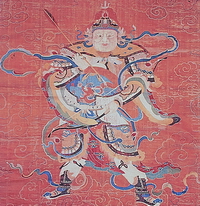 此像幅面宽大,在棕红色缎地上,用彩色丝线绣出广目天王形象。广目天王为佛教四大天王之一,据说他能以清净天眼观察护持世界,是由印度神话中猎手之神演变而来,身缠绢索绳,后来把绳子演变成蛇,取名“紫金龙”。龙代表变化,表示这个世界上的一切人、一切事、一切物,变化无常、反复多端,我们要通通把它们看清楚了,才能够应付。该天王脸呈方形,身体肥硕,两目圆睁,双腿左右开张,立于云中,披甲执弓,神态威武。此作品绣工精丽,堪称元代刺绣精品。 |