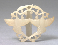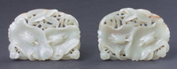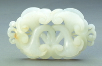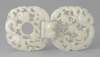 带扣用整块玉套雕而成,分子扣和母扣,正面镂雕两只盘螭,中心宝珠上螭绕珠而行,宝珠背面凸起一圆柱为钮,方形玉扣上浮雕一兽,将两扣相连,开合自如,琢刻精细。 |