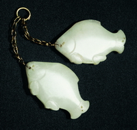 白玉圆雕,用阴线刻出眼、腮、腹鳍、尾等细部,双鱼嘴部穿孔用金链系佩。双鱼是佛教八吉祥之一,反映出佛教艺术对辽代玉器的影响。