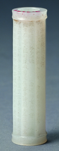 羊脂玉《般若波罗蜜多心经》勒子 北宋 “宣和”元年(1119年) 高5.8厘米,直径1.4厘米 首都博物馆藏