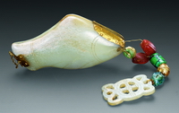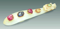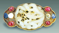 此器出自万历棺内,龙首形,背上四个金托中分别嵌红黄蓝宝石,龙额饰绿宝石,龙睛饰猫晶石。该器玉质细腻润泽,线条流畅,华贵富丽。 |