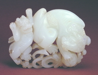 白玉质。圆雕一大一小二狮戏球,双狮前后呼应,形态生动活泼,写实性强。狮子滚绣球是中国传统娱乐形式,在很多地区都有流传。 |