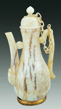 此器出自万历棺内,玉执壶是明代玉器中极有特点的玉器皿,造型受瓷器等工艺的影响,图案丰富,造型浑厚。该壶兽吞式流,盖与柄有玉链相连,腹部刻“卐”、“寿”二字及牡丹纹,雕工刚劲有力,下承金托。 |