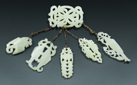 以镂雕绶带纹长方形玉饰系鎏金银链下挂5件玉坠而成,玉坠分别为摩羯、双鱼、双凤、双龙、鱼衔莲枝佩。龙、凤、鱼等吉祥题材的运用以及雕琢刻划中所表现出的写实风格,具有浓郁的中原文化气息,显示出辽地诸族文化的交流及玉器制作的发展水平。