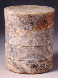 岫岩玉质。层与层之间以子母口套合,外壁阴刻花卉与覆叶纹,盖面刻折枝牡丹,花间山石旁,刻一孔雀驻足回望,画面颇有宋画 “折枝写生”的意趣,反映出女真入主中原后受中原文化的深刻影响,该器对研究金代贵族妇女生活习俗提供了重要的实物资料。 |