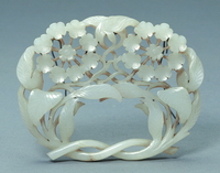 带板玉质莹润,在镂空锦地纹上采用镂雕、透雕技法雕出群婴嬉戏的图案,工艺精湛,为明代带板的代表作。 |