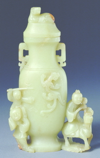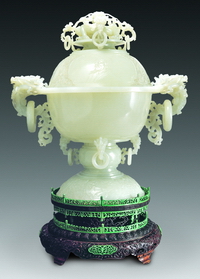白玉东方巨龙花熏 现代 高34.5厘米,宽32厘米,厚22厘米,连座高45厘米 夏长馨设计 北京工艺美术博物馆藏 |
