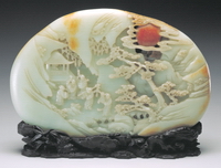 青玉,山形,雕山林景色,图中楼阁掩映,山石丛树间流云缭绕,一轮红日高照,该作品取三老之典故,有贺寿之意,三老旁有童子侍立,童子手中杂物中含喜庆、如意之意,寓意吉祥。 |
