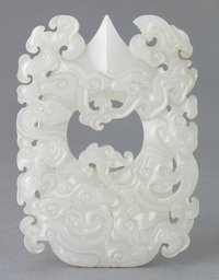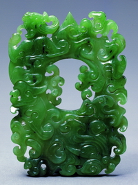 玉鸡心佩是汉代常见的一种佩饰。清代玉鸡心佩多仿汉代制品。此玉佩为镂空碾琢流云纹,两面纹饰相同,琢刻线条纤细、繁密、秀丽,抛光极好。 |