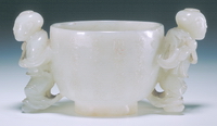 青玉,玻璃光泽强。双耳为两背向立童,杯腹前后均刻有诗句及“伯仁”二字款,足底阴刻篆字“永宝”。伯仁即文伯仁,明代嘉靖时期画家,文征明之侄。