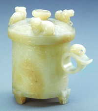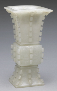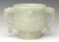 青玉。器型仿古时青铜,用作陈设。此器由三截粘合而成,腹部饰变形兽面纹,其他部位饰叶纹,为清代特有纹饰,纹饰优美,刀法精湛,器壁极薄,为清代仿古玉器中精品。 |