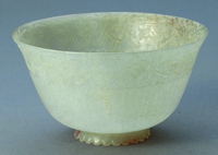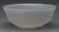 此玉碗壁薄不足1毫米,重45克,饰两层纹饰,外壁琢卷草纹和五瓣花,腹部琢外凸内凹的细瓣番莲纹。整器轻薄剔透如蛋壳,纹饰繁密柔美,琢刻技艺高超,抛光技术堪称一绝,是清代宫廷造办处仿痕都斯坦薄胎玉器中的代表作。 |