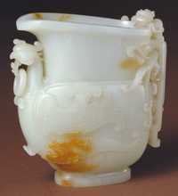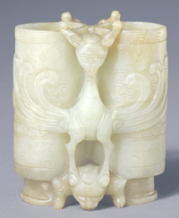 此器前端雕飞凤,后侧透雕蟠螭,构思巧妙,工艺细致。觥为古代青铜彝器,清代玉觥多仿其形与纹饰,但造型多变,清宫中除实用外,还用于陈设。 |