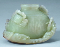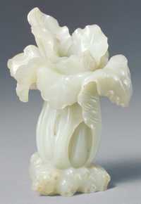 此器以多种技法琢成白菜形,口部倾斜,腹部饰前后翻卷的菜叶,造型极为生动逼真,是件不可多得的陈设工艺品。 |