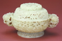 香熏是清代宫廷和官员家中广泛使用的净化空气的陈设品。该器器盖和器身镂雕牡丹纹,玲珑剔透,刀法娴熟,工艺精湛。牡丹为花王,象征富贵吉祥。 |