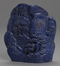 山子山石层叠,奇松横飞,溪流潺潺,雕琢技艺高超。青金石色质地细腻,材料硕厚,呈深蓝,色彩艳丽。山子一侧刻御题诗。 |