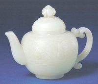 此壶玉质纯,光泽强。花形钮,腹部饰花蝶纹,琢刻精细。执壶为清代宫廷重要的陈设品。 |