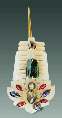 提头为荷叶形铜鎏金,两面錾刻双龙戏珠纹并镶嵌红蓝宝石,下部有四个环鼻用黄丝线组穿玉叶、花、桃、蝉、鱼等多种玉饰件。玉佩系于革带两侧显得雍荣华贵,行则作响铿锵,清脆悦耳,先声夺人。据记载,明代皇帝冕、弁服,皇后礼服均要带玉佩。 |