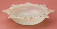 玉质莹润,打磨精细,通体散发出有清宫玉器中极有代表性的光泽。该器器型特殊,口沿外镂空凸雕八角菱花形,上嵌红绿宝石,为清宫仿欧洲艺术的代表作。 |