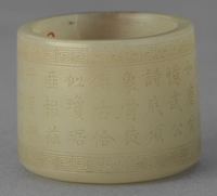 此件扳指上琢刻“乾隆御题”诗:“缮人规制玉人为,彄沓闓抨是所资。不称每羞童子佩,如磨常忆武公诗。底须象骨徒传古,恰似琼琚匪报兹。于度机张慎省括,温其德美信堪师。” |