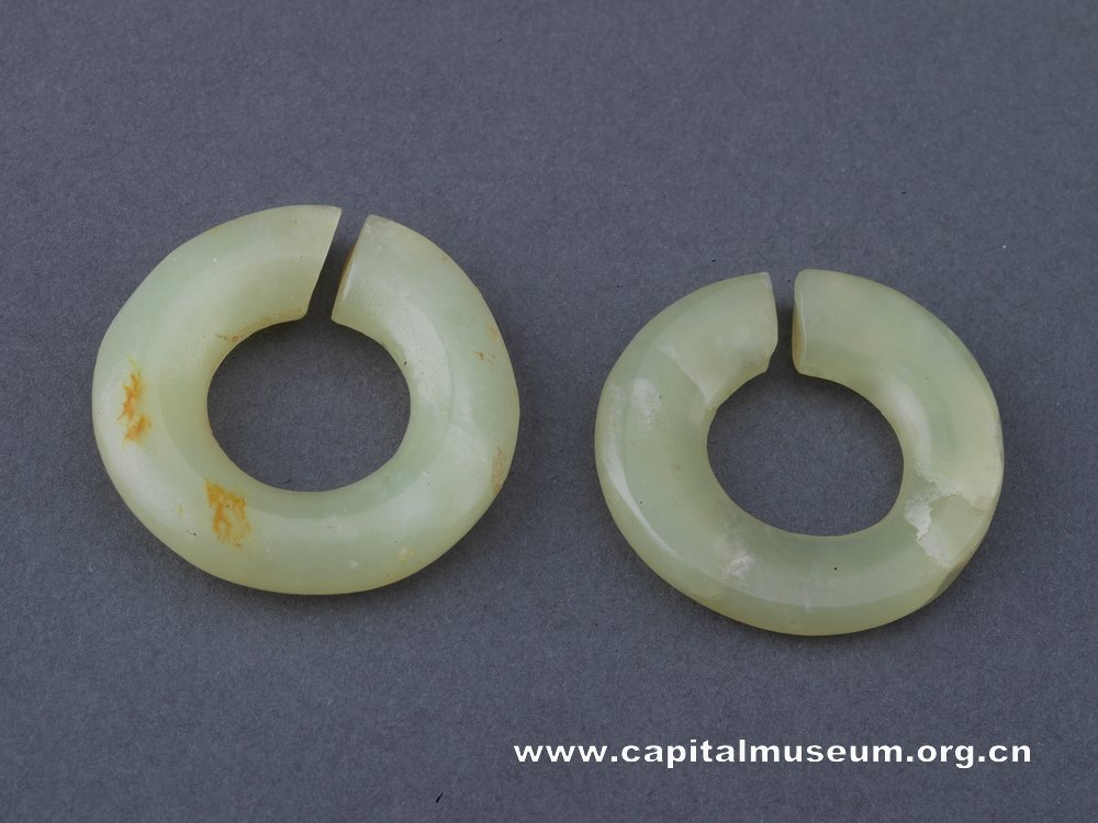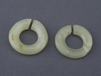 新石器时代中期·兴隆洼文化 左:直径2.9、孔径1.4厘米 右:直径2.8、孔径1.3厘米 内蒙古自治区敖汉旗兴隆洼原始聚落遗址M117号居室出土藏 |