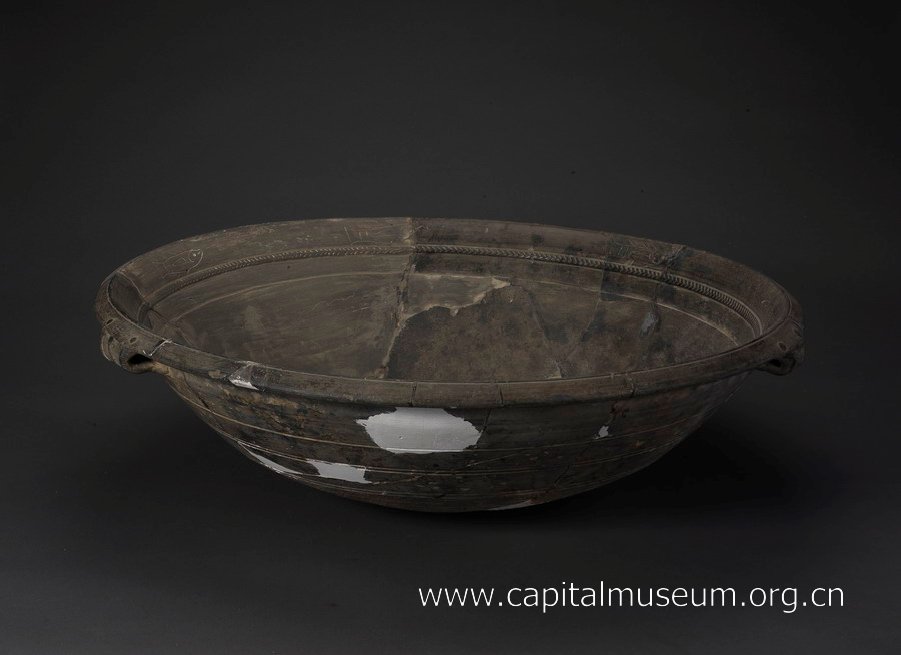 此盆发现于宫城外侧,形体硕大、通体磨光、制作精致。盆口内侧绕盆沿一周浮雕了一条长蛇,昂首卷尾,生动逼真。蛇身上方的盆口上还阴刻了一周鱼纹,笔法写实。有学者认为二里头文化的这些蛇纹装饰就是龙的形象。此盆的风格与山西省襄汾陶寺遗址出土的彩绘蟠龙纹陶盘颇为神似,都是在大型水器里装饰盘绕的龙(蛇),而龙(蛇)在我国古代传说中与水有密切关系,因此这种装饰龙(蛇)的陶盆可能用于祈雨等宗教祭祀用途。