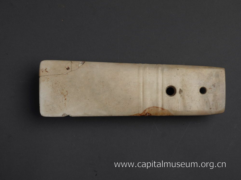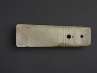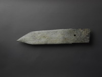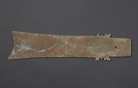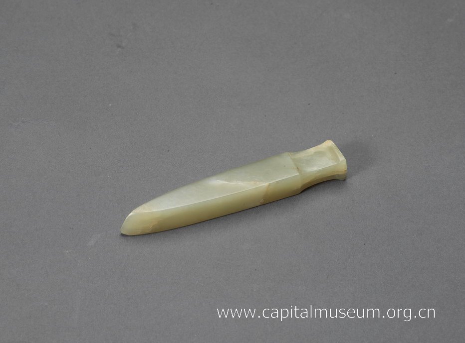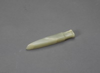 柄形器一般为片状,长方形,下端一般有榫,出现于二里头文化,流行于商代。关于柄形饰的功用,学术界还存在争论,有人认为是簪形器,有人认为属于佩饰,也有人认为是一种玉圭,还有人认为柄形饰是祖先的石主即牌位。