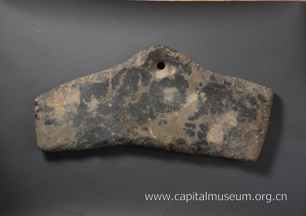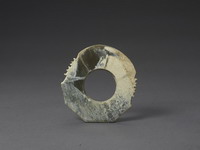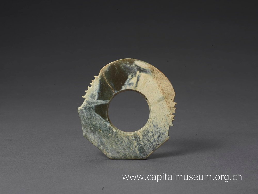 玉戚璧出现于新石器时代末期,从二里头文化开始流行。特征是器身近圆形、有大孔,两侧有扉齿,如同玉璧与与玉戚的合体,突出体现了二里头文化玉礼器将形式美与象征意义巧妙结合的特点。玉璧戚仍是玉钺的一种,也是象征权力与威仪的玉礼器,从二里头文化随葬玉戚璧的墓主身份都较高可窥见一斑。这件玉戚璧造型规整,工艺精湛,是这一时期玉戚璧的代表。