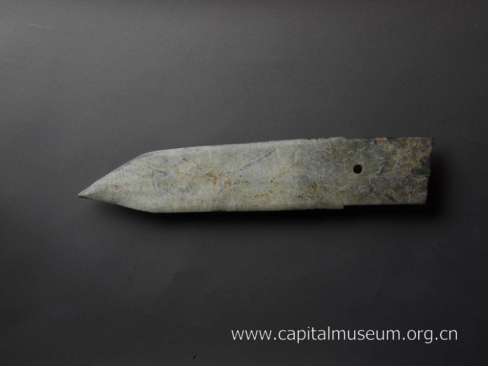这件玉刀源自新石器时代晚期的多孔玉刀,不同之处在于这件玉刀两侧饰有扉齿,具有浓郁的二里头文化玉质礼兵器的特点。