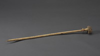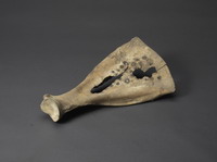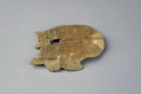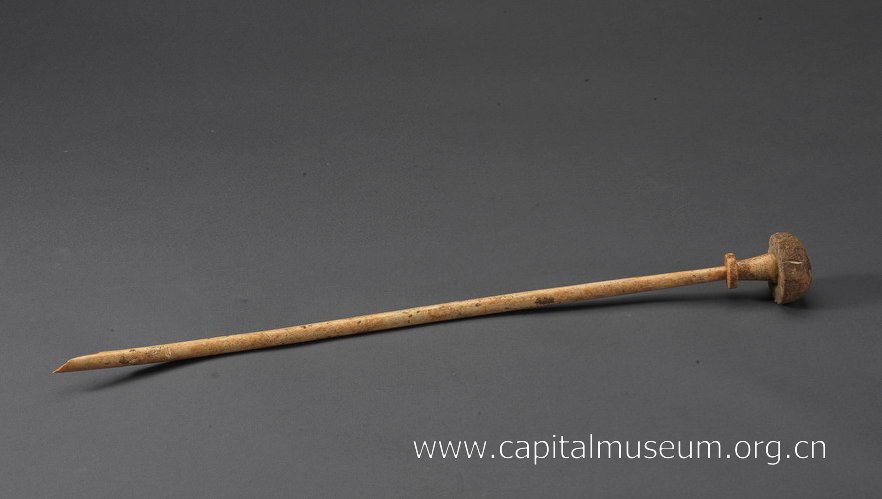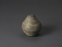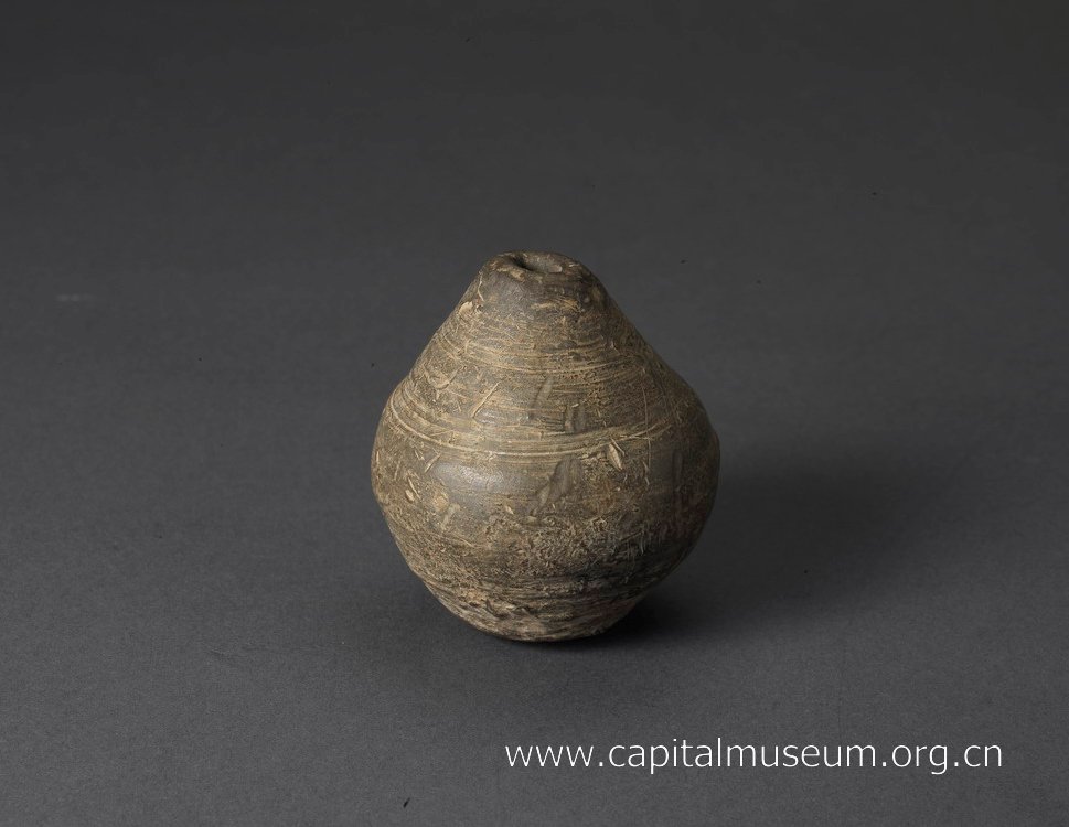 埙是我国特有的闭口吹奏乐器,以陶土制成。陶埙最初只有吹孔而无音孔,可能是先民们为诱捕猎物而模仿鸟兽叫声制作的。之后陶埙日趋复杂精巧,音孔逐渐增加,演化为可以吹奏曲调的旋律乐器。最早的陶埙可追溯到陕西省西安半坡遗址出土的约公元前4000年左右的无音孔和1音孔陶埙,陶寺遗址出土的陶埙已有两个音孔。这件二里头文化的陶埙只有1个音孔,略显原始。