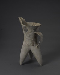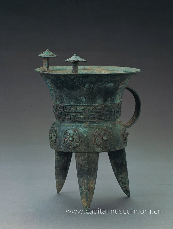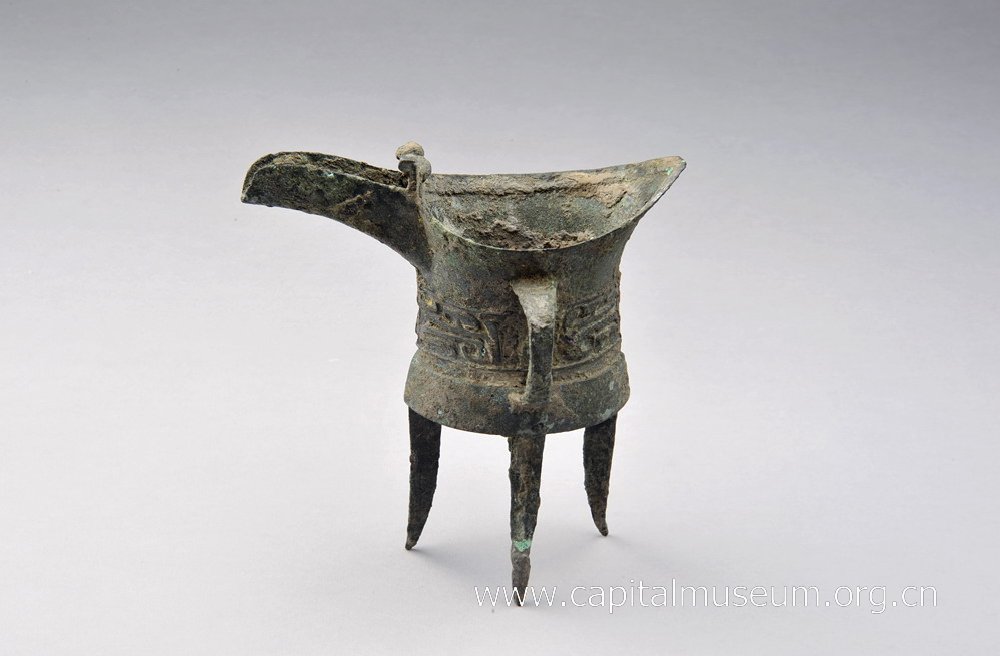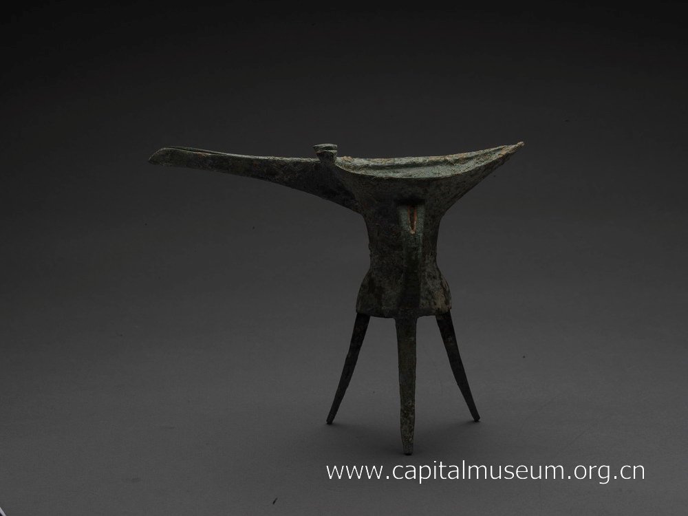 爵是二里头文化发明的酒器,主要用于温酒和注酒。其特征是腹底有三个细长足,腹侧有一鋬,口沿两端分别有半管状流和配重的尾。二里头文化的铜爵系模仿陶爵,是已知最早的青铜容器,以其飘逸、挺拔的外形美和平衡、稳重的对称美开创了我国青铜造型艺术的新篇章。二里头文化的铜爵、铜斝和铜盉构成了最早的青铜酒器,而铜爵和铜斝的组合则为商代青铜酒器所继承。