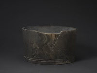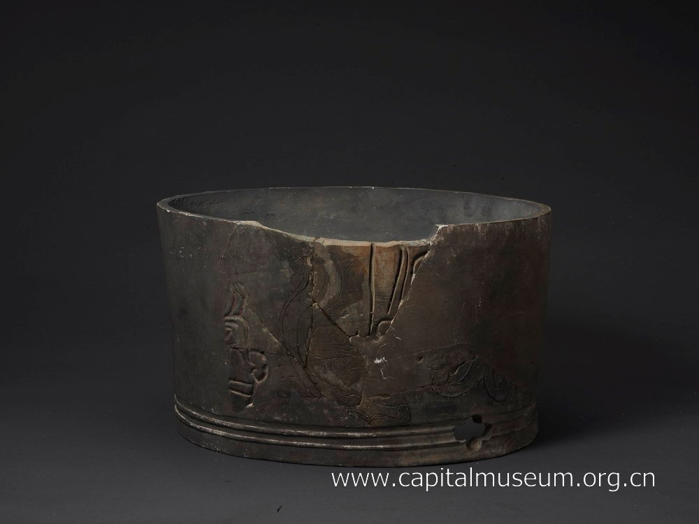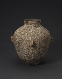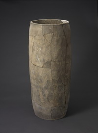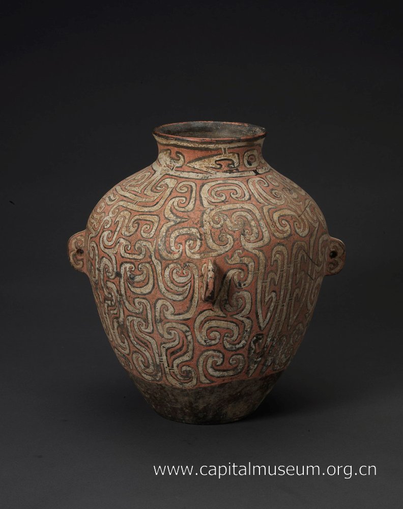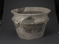 尊是大型盛酒、酿酒器。甲骨文中的“酉”字就是以大口尊为原型的象形字,“尊”字则是两手捧着大口尊的形象,而“尊”与“奠”通用,表示祭祀时献酒。这件陶大口尊的特别之处在于肩部的一周纹饰是图案化的龙纹,与商周时期的夔(kuí)龙纹颇为相似。夔龙纹即龙的侧视图案,在陶寺遗址出土的史前彩绘陶器上已出现。